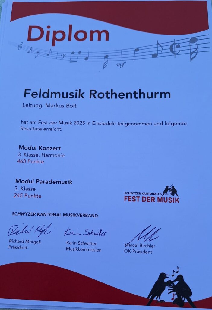 Wir verbrachten ein schönes Fest am Kantonalen und sind stolz auf unsere Leistung mit einem «gut» im Modul Konzert und einem «sehr gut» in der Parademusik. Danke an alle die uns unterstützt haben.